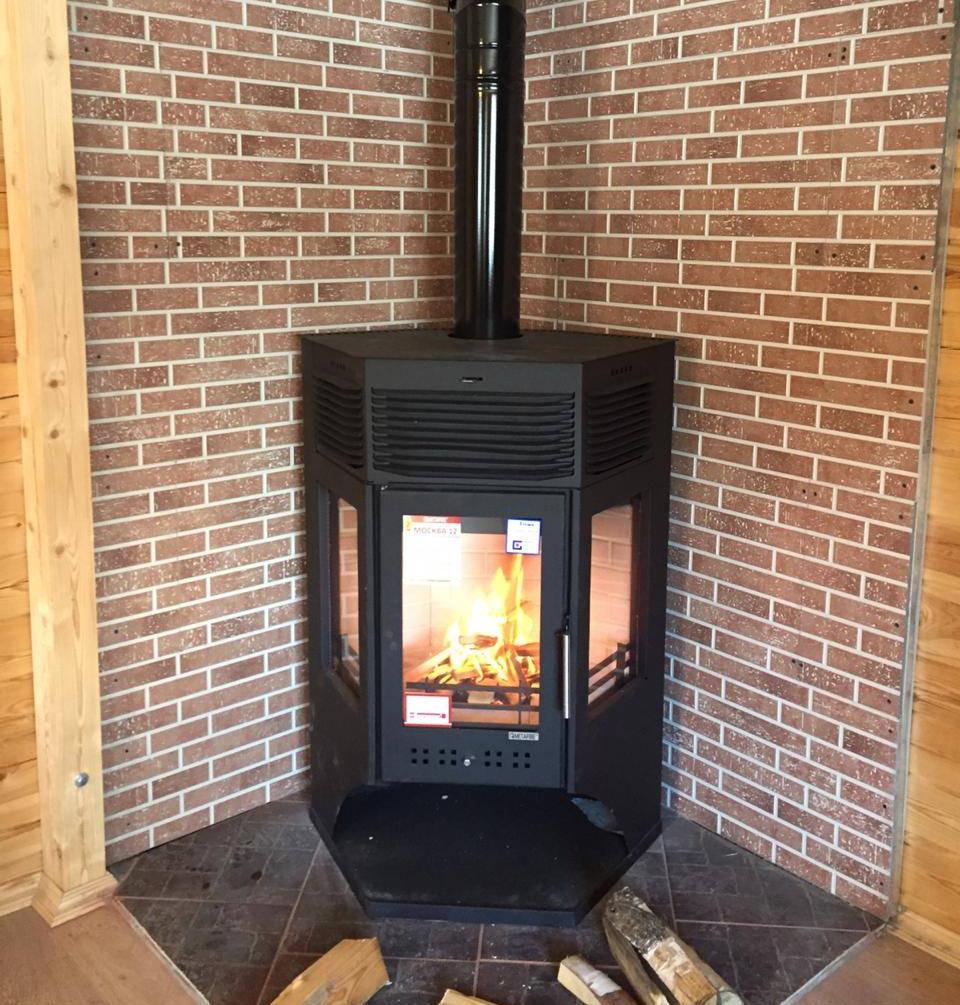 Печь-камин компании Мета, модель Москва 12. С чёрным дымоходом из эмали, комбинируемой в нержавейку на втором этаже. Стены изолированы фактурной плитой.