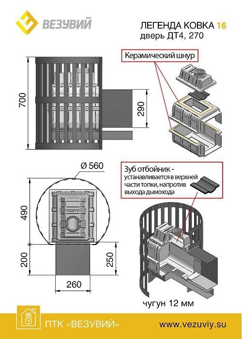 Топка банной печи «Легенда Ковка 16 (270)» собрана из трёх чугунных частей толщиной в 12 мм. В соединении между ними используется керамический, высокотемпературный шнур (до 1200С) что обеспечивает непревзойденную герметичность! Для скрепления деталей между собой используется болтовое соединение, что гарантирует безопасную эксплуатацию на все 100%. Изготавливается материал из специального сплава чугуна, который выдерживает максимальные температурные перепады! В случае попадания большого количества воды на топку, она сохранит свою целостность и не лопнет, что бывает довольно часто с обычным чугуном.