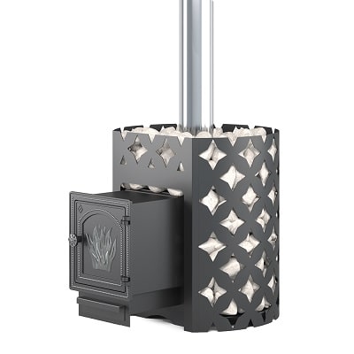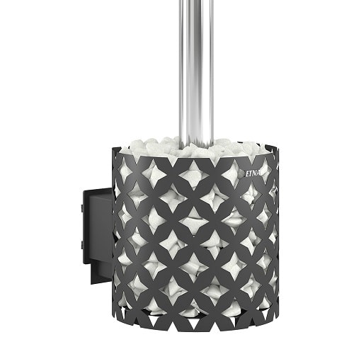 Для устройства наружной открытой каменки печь ЭТНА 18 оснащается металлическим кожухом с прорезным рисунком оригинального дизайна. Пространство между печью и кожухом из двухмиллиметровой стали заполняется камнями для бани, которые выполняют роль теплонакопителя, перераспределяют тепло от стенок топки и защищают парящихся от жёсткого инфракрасного излучения. Воду подают на нагретые камни, с которых полученный пар распространяется по всему объёму парной. Кожух диаметром 560 миллиметров вмещает в себя до 110 килограммов камней крупной и средней фракции.