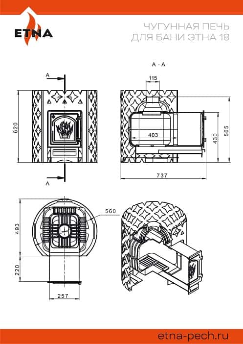 В нижней части топочной камеры размещается чугунный колосник, предназначенный для подачи воздуха на дрова снизу. Для повышения теплоотдачи и максимального использования энергии горения дров в верхней части печи расположен пламегаситель, изменяющий направление движения дымовых газов и обеспечивающий полное сгорание. Чугунная деталь перекрывает прямой путь пламени и газов в дымоход, что улучшает тепловые показатели печи ЭТНА 18.