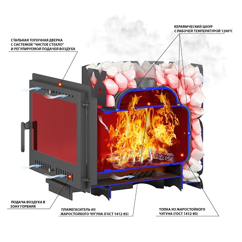 Преимущество банной печи в том, что топка печи состоит из 3-х Чугунных элементов (ГОСТ 1412-85) толщиной до 8мм. На стыке между ними используется керамический шнур с рабочей температурой 1200 градусов. То есть топка печи абсолютно герметична! Для фиксации деталей между собой применяется болтовое соединение, что даёт 100% гарантию безопасности при эксплуатации.