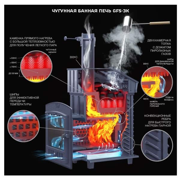 Чугунные банные печи ГЕФЕСТ — это 2-камерные топочные агрегаты, оборудованные системой дожига пиролизных газов, которая быстро нагревает каменку с зарядом или переводит печь в режим длительного горения.