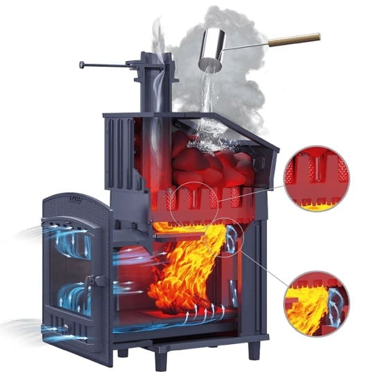 Модель GROZA выполнена на базе топочного агрегата - экономичная модель для частного применения. Основной принцип работы печи сохранён – получение пара с теплоёмкой каменки прямого нагрева. Каменка является сводом топки, нагревается с нижней поверхности снабженной теплосъемными шипами для увеличения контакта с пламенем.