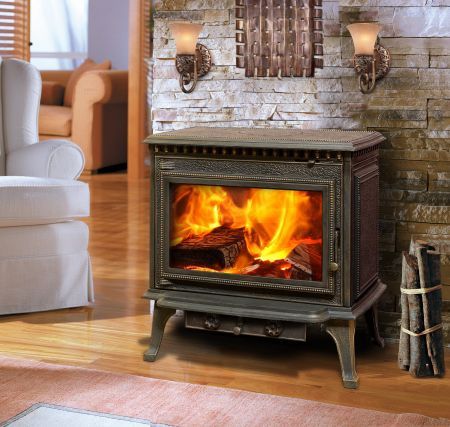Печь Ричард выполнена в стиле ретро. Стилизованность "под старину" подчеркивает бронзовая патина.