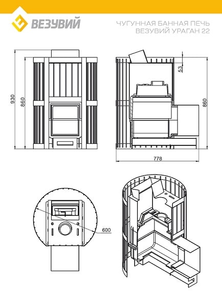 Стоит также отметить, что печь "Ураган Стандарт 22 (ДТ-4С)" укомплектована негерметично закрывающейся дверцей оснащенной жаростойким 4мм стеклом "Shot Robax", со свойством самоохлождения. Закрытая каменка изготовлена из стали и вмещает в себя не менее 60кг камней. Не забываем и про конвекционно-вентилируемый кожух "Стандарт" изготовленный из металлических 6мм прутьев с черной термостойкой покраской.