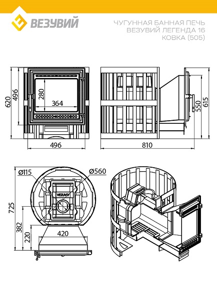 Стоит также отметить, что печь Легенда Ковка 16 (505) укомплектована герметичной дверцей с жаростойким, самоохлаждающимся 4мм стеклом "Shot Robax". Не забываем и про конвекционно-вентилируемый кожух "Ковка" изготовленный из текстурированной металлической полосы с термостойкой покраской и нанесением патины «Бронза».