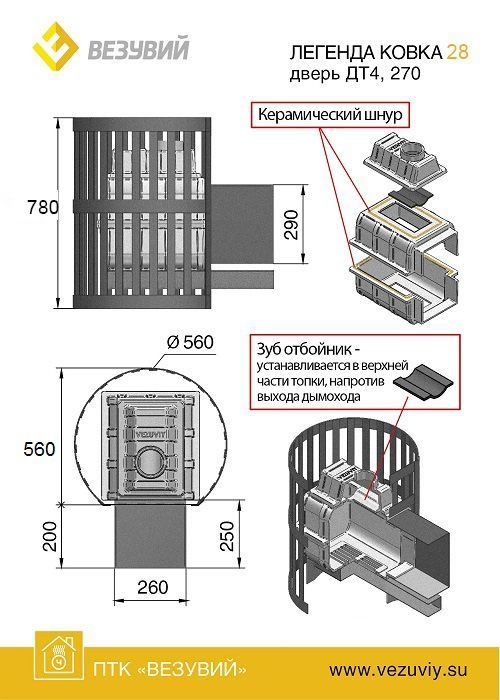 Печь удобна в использовании и благодаря тепловой мощности большого количества камней в сетке, оптимально подходит для равномерного прогрева парильного помещения. Выносной портал обеспечивает чистоту парилки за счет вывода всех работ по растопке и поддержанию огня в смежное помещение.