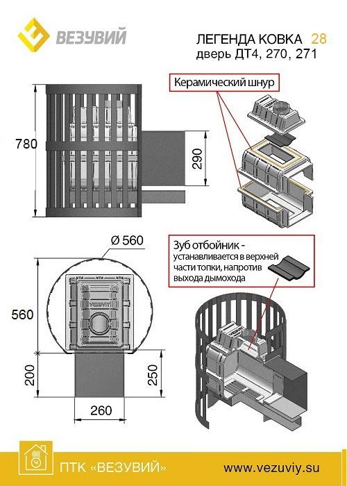 Печь удобна в использовании и благодаря тепловой мощности большого количества камней в сетке, оптимально подходит для равномерного прогрева парильного помещения. Выносной портал обеспечивает чистоту парилки за счет вывода всех работ по растопке и поддержанию огня в смежное помещение.