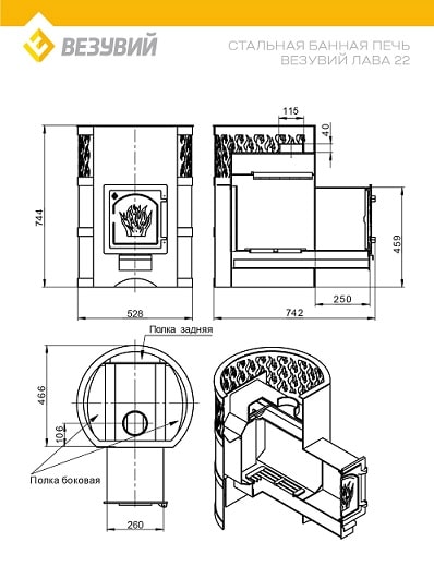 Стальная банная печь серии Лава усовершенствованной конструкции работает на дровах и предназначена для нагрева пространства парной и получения пара. Печь Везувий Лава 22 (ДТ-4C) рассчитана на объем парной 12-24 кубометров.