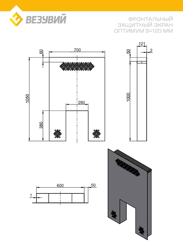 Фронтальный защитный экран применяется для монтажа печей Везувий с целью разграничения пространства парной и комнаты отдыха (или предбанника). Экран отлично подойдёт для обустройства стены из кирпича или другого негорючего материала в случаях, когда нет возможности сделать полноценный портал.