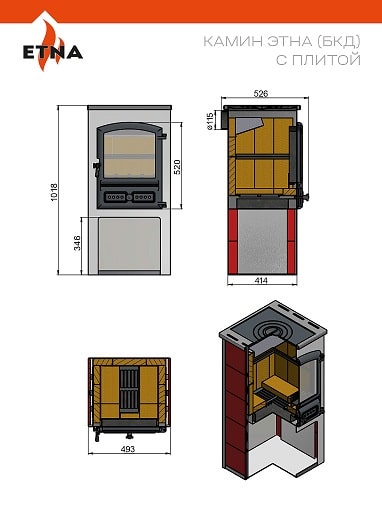 Конструкция печи-камина ЭТНА БКД с плитой разработана с учётом необходимости быстрого разогрева помещения и последующего длительного поддержания теплового комфорта в загородном доме, на даче или в другом ограниченном пространстве. ЭТНА БКД рассчитана на пристенное размещение. Чугунная плита обеспечивает приготовление или разогревание еды.