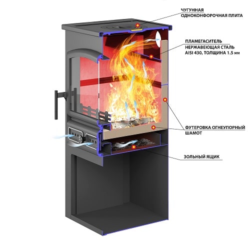 Внутренняя поверхность топочной камеры защищена от прямого воздействия открытого огня шамотным кирпичом. Этот элемент топки предотвращает контакт металла корпуса с огнём и прогорание стальных стенок даже при высоких температурах. Кроме того, кирпич способствует равномерному нагреву печи, способен накапливать тепло и потом длительное время передавать его в окружающее пространство.