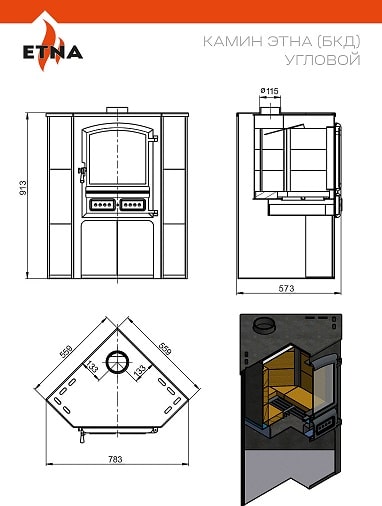 Патрубок дымохода печи-камина ЭТНА устроен на задней стенке печи и имеет диаметр 115миллиметров. Он предназначен для подключения дымохода и вывода продуктов горения в атмосферу.