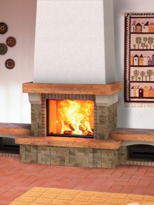 Пристенная каминная облицовка Woodward выполнена в стиле "кантри" из цветного мрамора грубой обработки, фигурные консоли - из гладкообработанного камня, балка - из массива дуба. Для хранения дров предусмотрены два вместительных отсека, расположенных под боковыми банкетками.