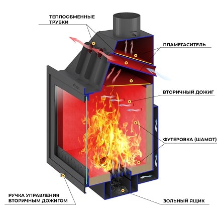 Топка оборудована системой вторичного дожига дымовых газов, которая позволяет получить максимум энергии при горении дров. Каналы вторичного дожига расположены на задней стенке топочной камеры прямо в шамотной облицовке.