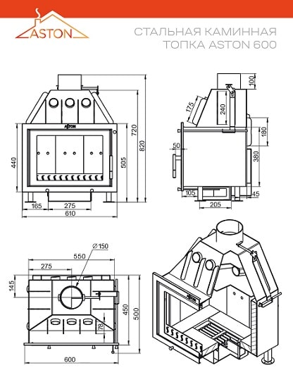 Пламя и дымовые газы, догорая, огибают пламегаситель в верхней части топочной камеры. В дымосборнике над конвекционными трубами расположен второй пламегаситель, который повторно меняет направление движения газов и таким образом способствует их полному догоранию в топке. За счёт совместной работы двух пламегасителей достигается максимальная тепловая эффективность каминной топки АСТОН 600, в том числе повышается теплоотдача печи путём усиления конвекции.