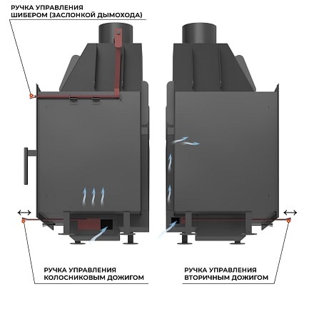 Регулирование тяги возможно с использованием шибера, встроенного в патрубок дымохода диаметром 150 мм. Ручка управления шибером размещается на передней поверхности топки, справа вверху.