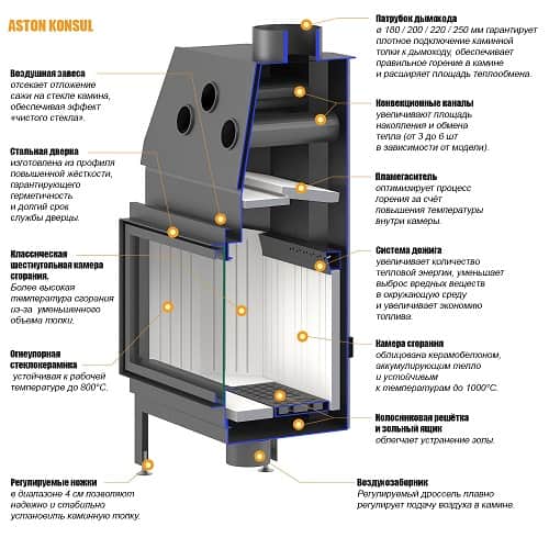 Каминные топки ASTON KONSUL – это максимально оптимизированный процесс эксплуатации. Топки серии KONSUL генерируют оптимальное количество тепла при экономичном расходе древесины. За это отвечают инновационные решения, в виде керамобетонной футеровки с термостойкостью до 1000°C, концентрирующей тепло, а также специальные пламегасители, повышающие температуру внутри камеры. На производительность каминной топки влияет также шестиугольная камера сгорания, где повышается температура за счёт уменьшения кубатуры. Таким образом, легко получить оптимальное тепло в доме без риска перегрева помещения.