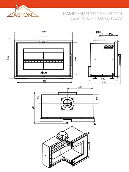 Дверь каминной топки АСТОН Сенатор – стальная, с большим обзорным стеклом. Диагональ двери 102 сантиметра, диагональ видимой части стекла – 75 сантиметров. Стекло сделано из керамического сплава, выдерживает постоянные рабочие температуры до 650 градусов. На рамке двери оно закреплено на двух планках, расположенных сверху и снизу двери.