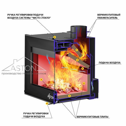 Вермикулит – материал, способствующий сохранению геометрии топки и защищающий сталь от перегрева. Вермикулитовые стенки и дно топки обеспечивают равномерное распределение высоких температур внутри топки в процессе горения, в том числе предотвращая засаживание стекла.