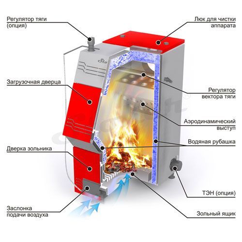 Котёл работает на угле, дровах, а при подключении ТЭНа — и на электричестве. Это обеспечивает гибкость выбора топлива в зависимости от условий и бюджета. - Продуманная конструкция
