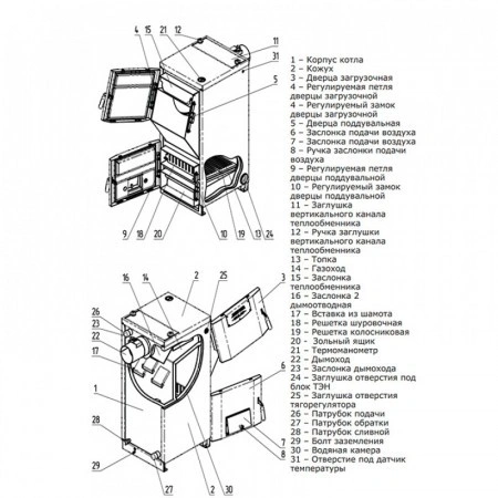 Загрузка топлива через наклонную топочную дверцу, закрывающуюся на замок.