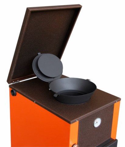 - Также на лицевой стороне установлены термометр 16 для контроля температуры теплоносителя в котле и две дверцы: