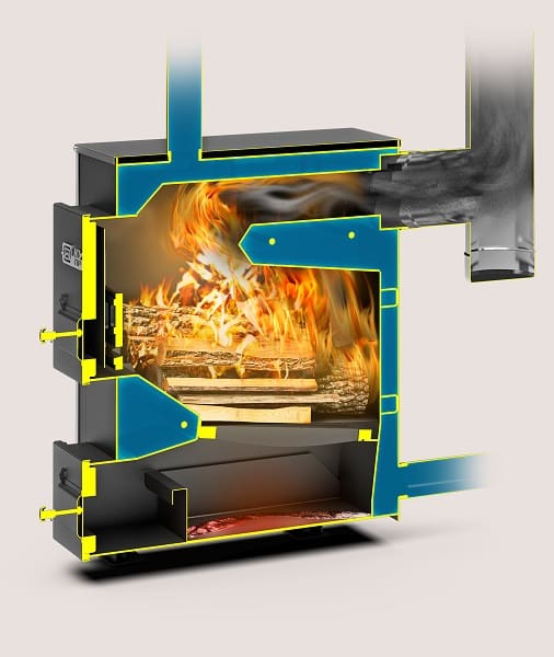 - Глубокая наклонная топка для использования длинных дров и равномерного распределения угля по всей глубине топки при засыпке.