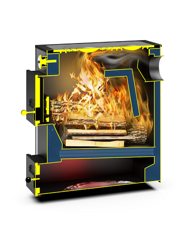 - Глубокая наклонная топка для использования длинных дров и равномерного распределения угля по всей глубине топки при засыпке.