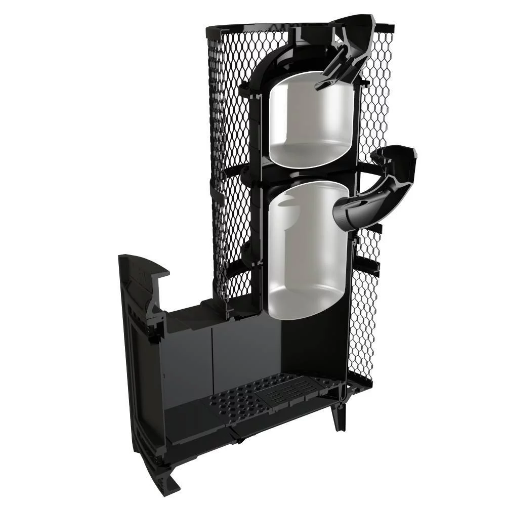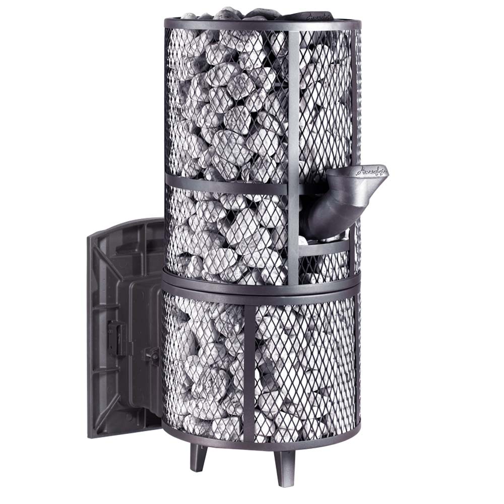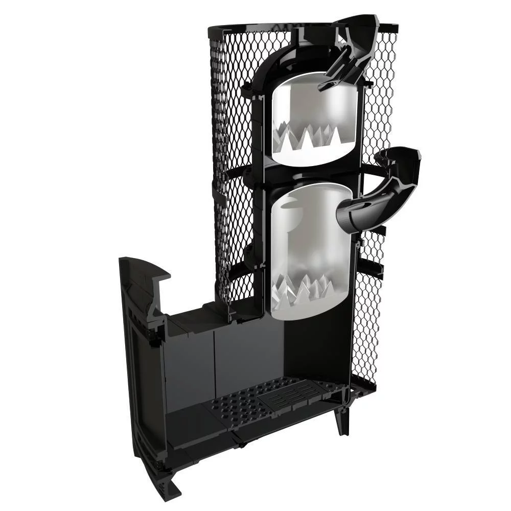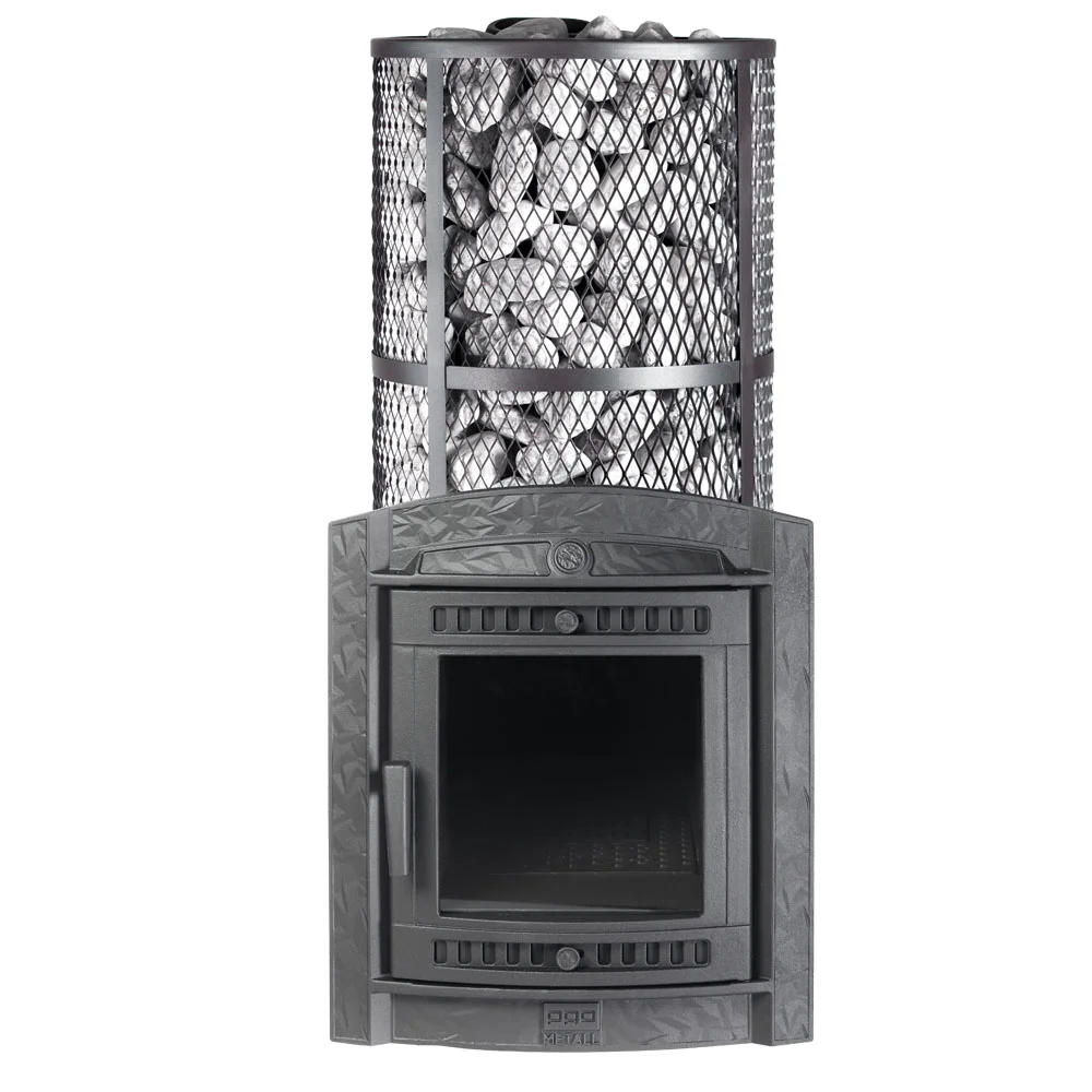 Модель с двумя внутренними каменками обеспечит максимальное количество пара в больших помещениях. Кожух печи изготовлен в виде сетки из нержавеющей стали и полностью заполняется природными камнями, обеспечивая высокую динамику нагрева парильного помещения.