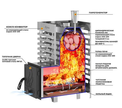 - Материал закрытой каменки: нержавеющая сталь AISI 430