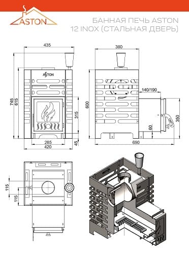 Линейка печей ASTON из нержавеющей стали рассчитана на установку в парные объёмом от 6 до 22 м3.