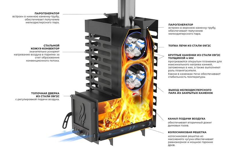 - Стальной кожух-конвектор значительно ускоряет нагревание воздуха в парилке за счет образуемого им мощного воздушного потока.