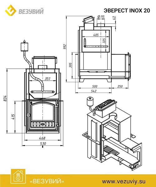 Модель «Эверест 24» имеет сборную конструкцию, лишена дополнительных сварных и резьбовых соединений, сборка печи выполнена по системе «выступ-паз». Каждая деталь печи может меняться отдельно, без необходимости замены всей печи целиком.