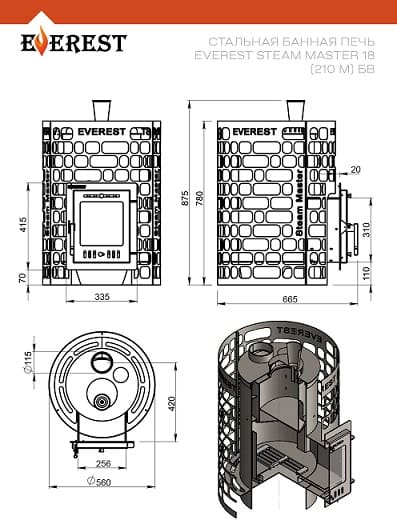 Печь для бани Эверест "Steam Master" 18 (210М) изготовлена из особо прочной котловой стали 09Г2С. Печь предназначена для установки в частные и коммерческие бани с объёмами парных помещений до 18 кубических метров.
