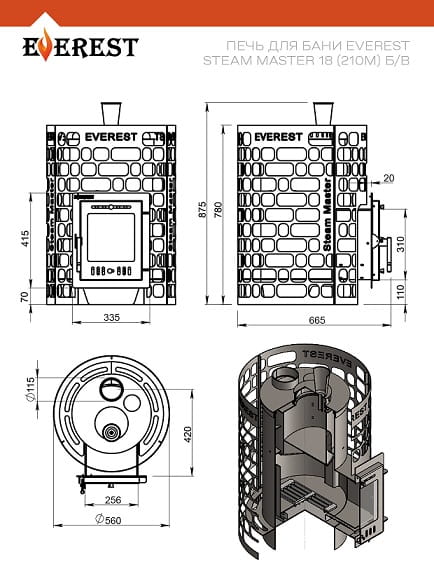Конструкция печи включает в себя съёмную закрытую каменку из нержавейки марки AISI 430 толщиной 4 мм, расположенную в верхней части топки.
