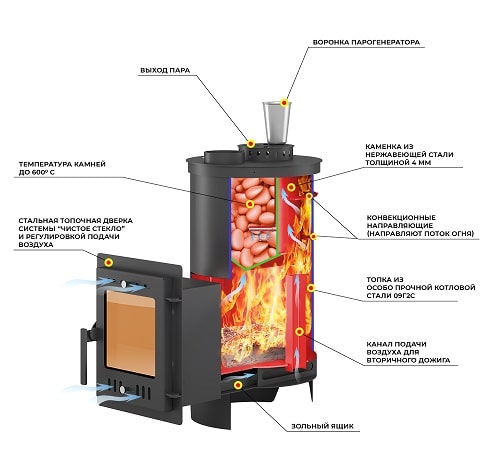Конструкция печи включает в себя закрытую каменку из нержавейки марки AISI-430 толщиной 4 мм, расположенную в верхней части топки. Каменка размещена прямо на пути пламени и дымовых газов, что позволяет нагреть камни до температур свыше 600 градусов по Цельсию.