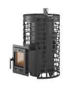 Печь и сетка внешней каменки цилиндрической формы, компактная и удобно размещаемая в парилке. Выносной тоннель при монтаже печи проводится через стену и предполагает обслуживание печи из смежного помещения.