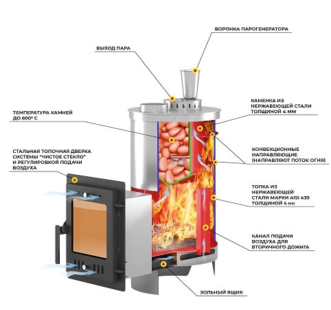 Конструкция печи включает в себя закрытую каменку из нержавейки марки AISI 430 толщиной 4 мм, расположенную в верхней части топки. Каменка оригинальной формы размещена прямо на пути пламени и дымовых газов, что позволяет нагреть камни до температур свыше 600 ºС.