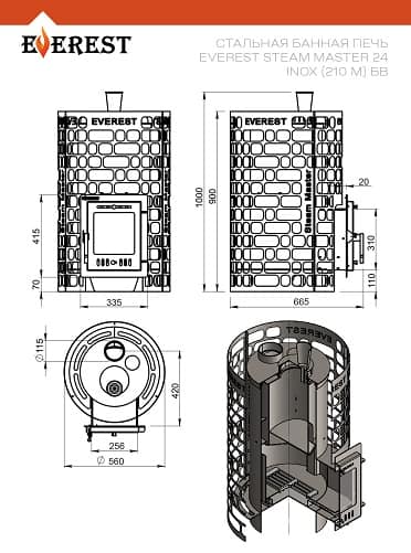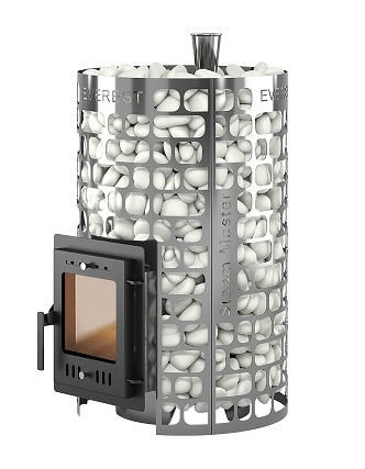 Внешний тепловой контур образован открытой каменкой в виде цилиндрической сетки, вмещающей в себя ок. 100 кг камней. Сетка сделана из стали, в новом минималистичном дизайне EVEREST.
