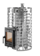 Печь и сетка внешней каменки цилиндрической формы, компактная и удобно размещаемая в парилке. Выносной тоннель при монтаже печи проводится через стену и предполагает обслуживание печи из смежного помещения.