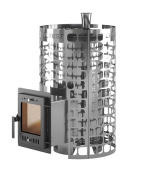 Печь и сетка внешней каменки цилиндрической формы, компактная и удобно размещаемая в парилке. Выносной тоннель при монтаже печи проводится через стену и предполагает обслуживание печи из смежного помещения.
