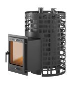 Печь и сетка внешней каменки цилиндрической формы, компактная и удобно размещаемая в парилке. Выносной тоннель при монтаже печи проводится через стену и предполагает обслуживание печи из смежного помещения.