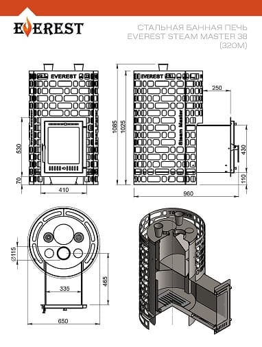 Печь для бани Эверест "Steam Master" 38 (320М) изготовлена из особо прочной котловой стали 09Г2С. Печь предназначена для установки в частные и коммерческие бани с объёмами парных помещений до 38 кубических метров.