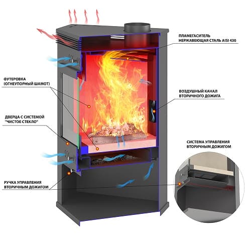 На задней стенке топочной камеры расположен канал для подачи воздуха на вторичный дожиг.