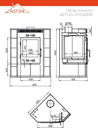 Между «крышей» топки и верхней панелью печи-камина АСТОН 11 кВт угловой есть свободное пространство. Оно служит для усиления конвекционных свойств печи и снижает степень нагрева панели.