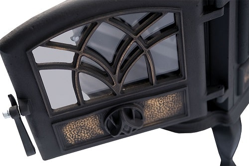 Термостойкое стекло в дверце топочной камеры позволяет наблюдать за процессом горения без необходимости открытия дверцы. Герметичность конструкции обеспечивается специальным термостойким шнуром, предотвращающим проникновение воздуха между дверцей и корпусом печи.