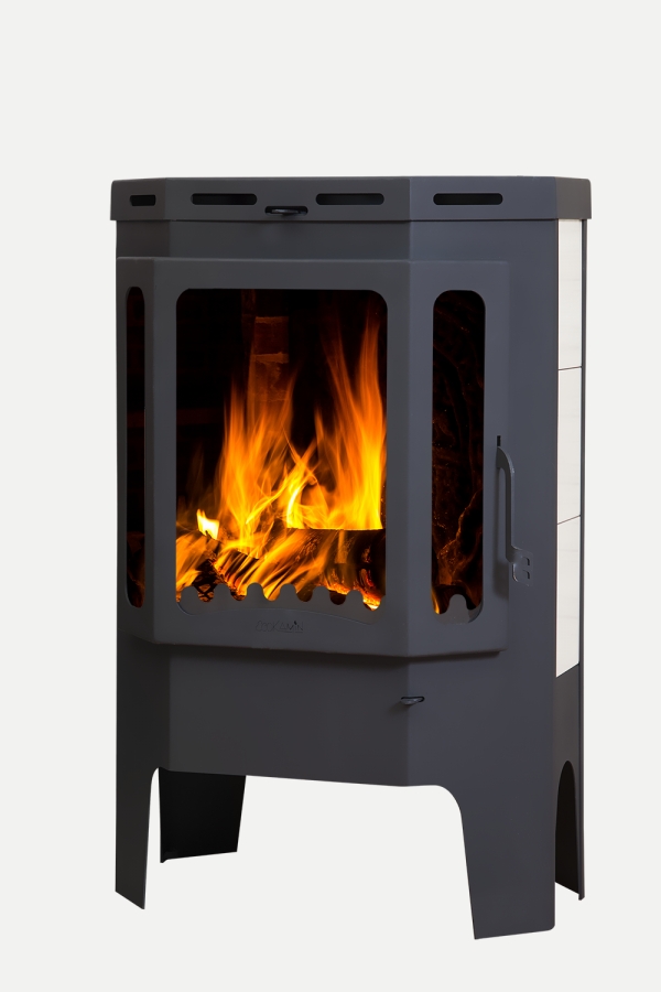 Пристенно-угловая печь выполнена из стали темного цвета. Ее дизайн универсален и подойдет для любого интерьера. Своеобразной «изюминкой» печи являются боковые панели, декорированные керамической плиткой, и обзорное стекло, позволяющее наблюдать за горением дров в топке. Для данной модели Призматик характерно стекло призматической формы, что увеличивает площадь обзора. Кроме того, это придает печи особый дизайн и привлекательность.