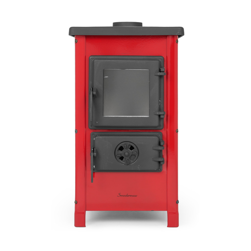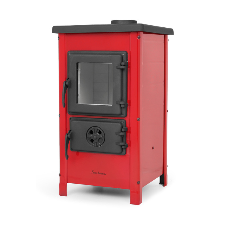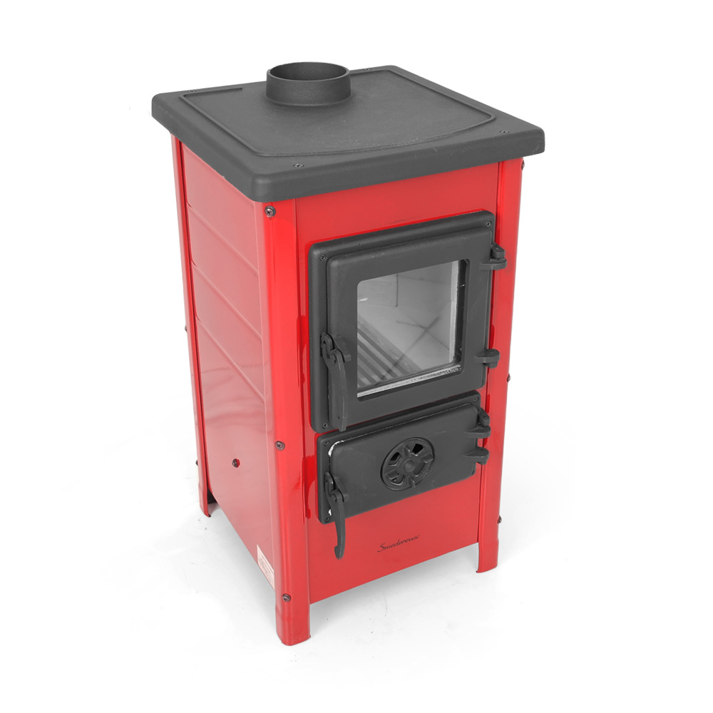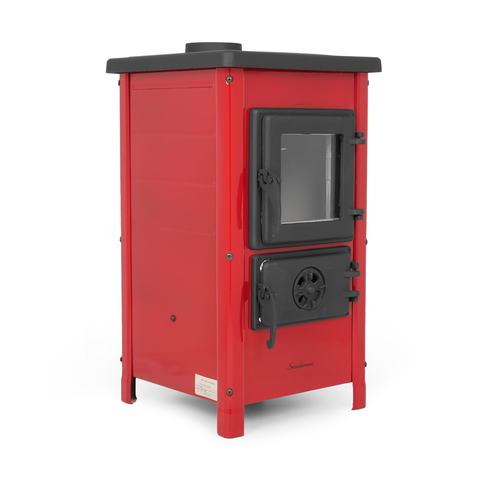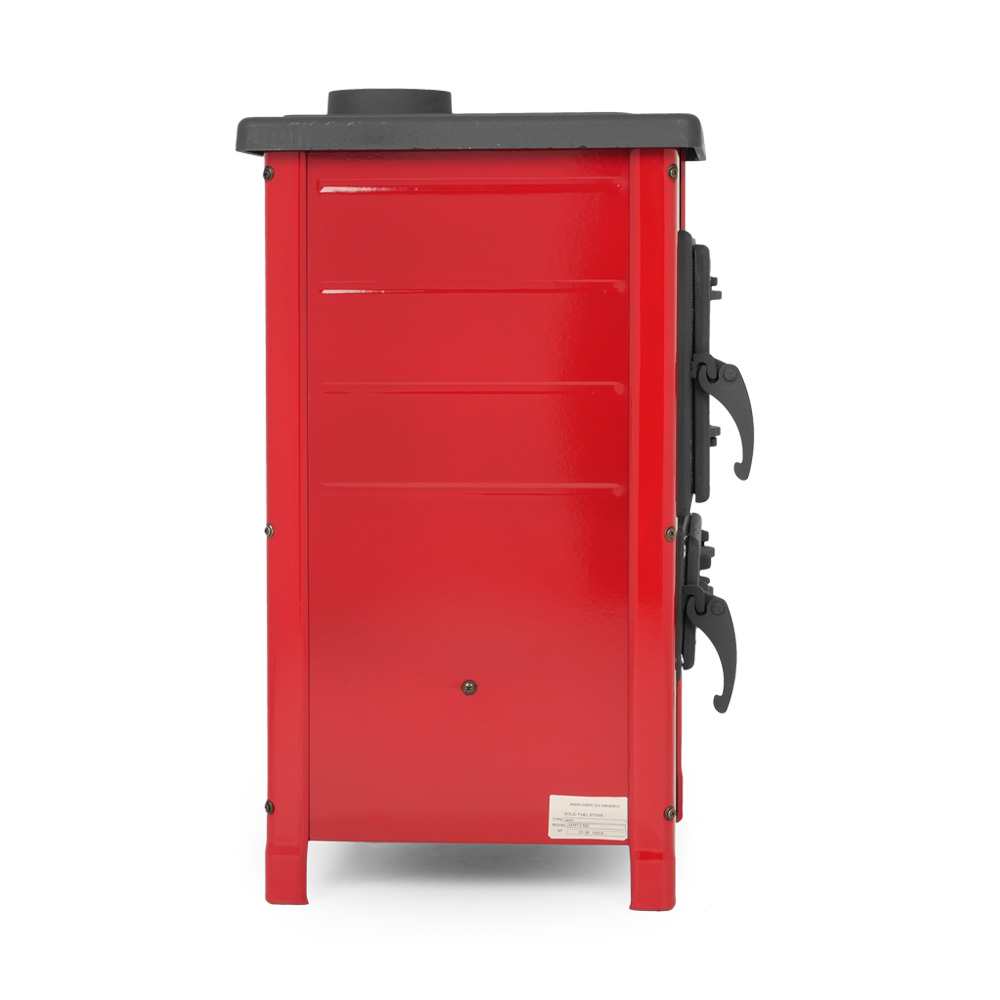 Компактная печь-камин MBS Happy Red подходит для обогрева помещений объемом до 120 м³. Внутренняя часть топки облицована шамотным кирпичом, что защищает металлические стенки от перегрева и повышает эффективность сгорания дров. Верхняя чугунная плита позволяет использовать печь для приготовления или подогрева еды.