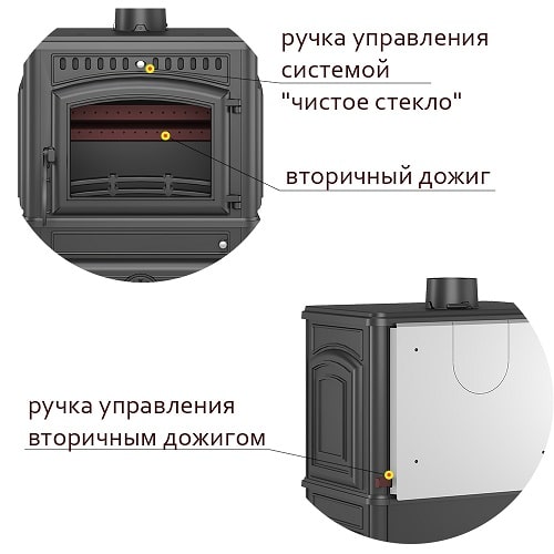 - встроенный шибер в чугунном патрубке дымохода;